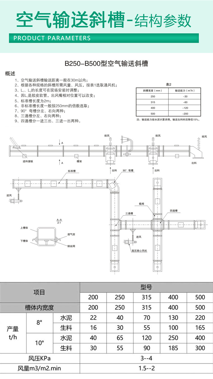 空氣輸送斜槽是通過氣流順管道輸送粉末顆粒物料的裝置。有三種類型:吸入式、壓力式和混合式。其工作原理是利用氣流的動能使顆粒物料隨氣流沿管道懸浮輸送;設備主體部分無傳動部分,采用新型涂層,便于密封操作和管理。