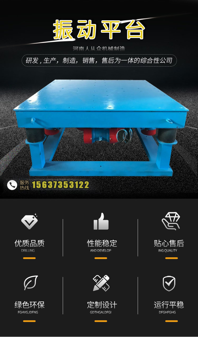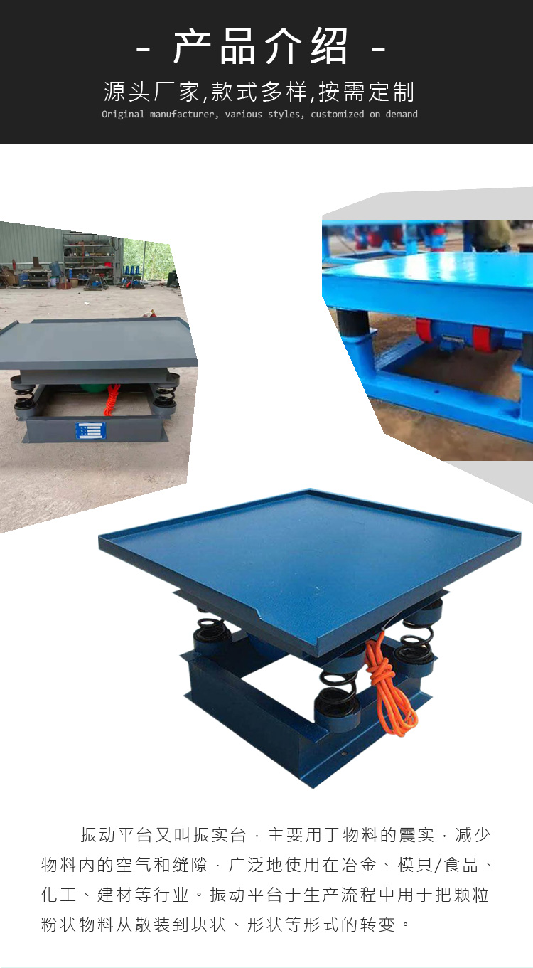 三維振動平臺廣泛應用于冶金、模具、建材等行業,臺面高度可調,上下左右前后三維立體振動,頻率可調、性能穩定,操作簡單。