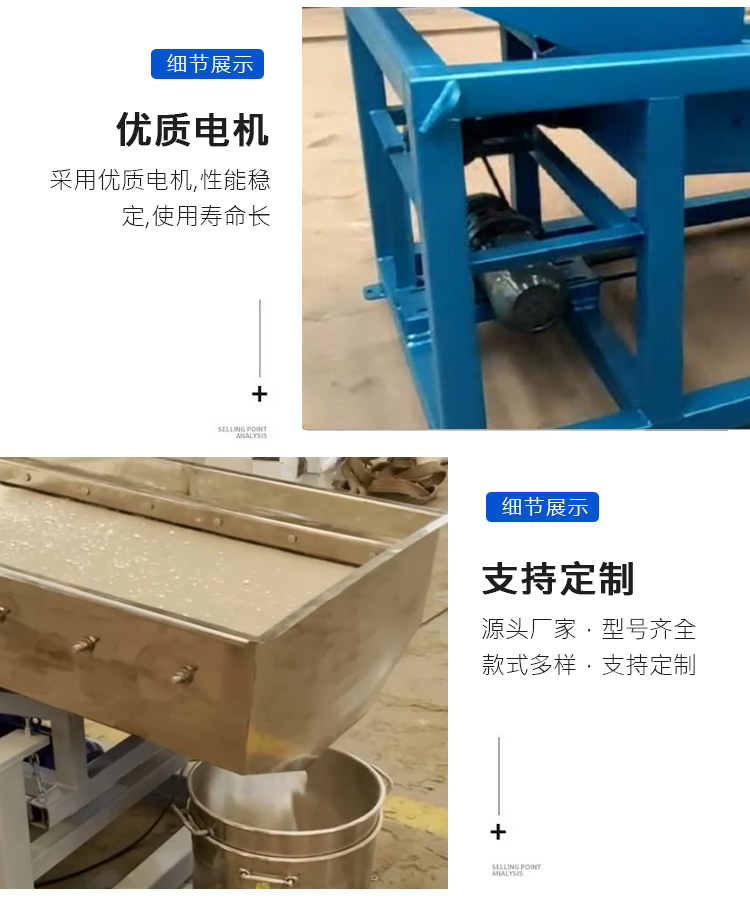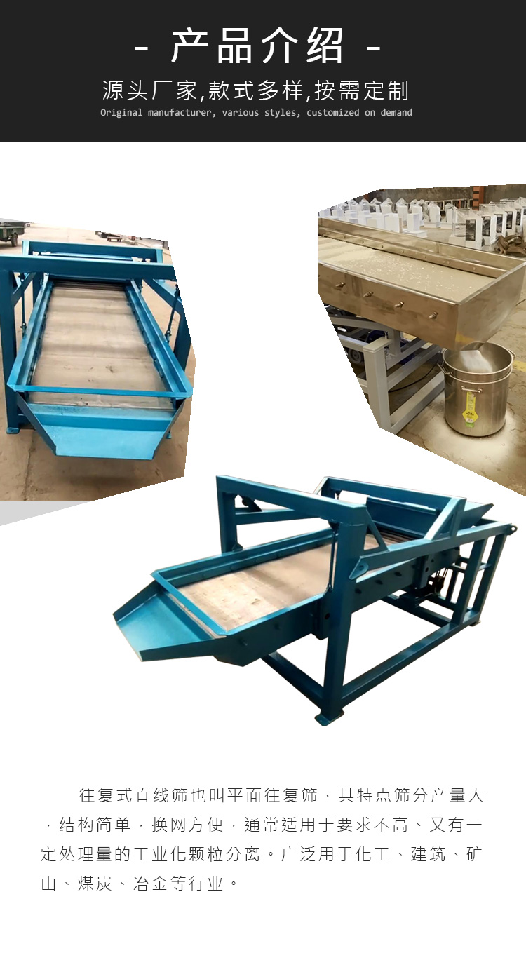 往復式直線篩也叫平面往復篩,其特點篩分產量大,換網方便,通常適用于要求不高、又有一定處理量的工業化顆粒分離。廣泛用于化工、建筑、礦山、煤礦等行業